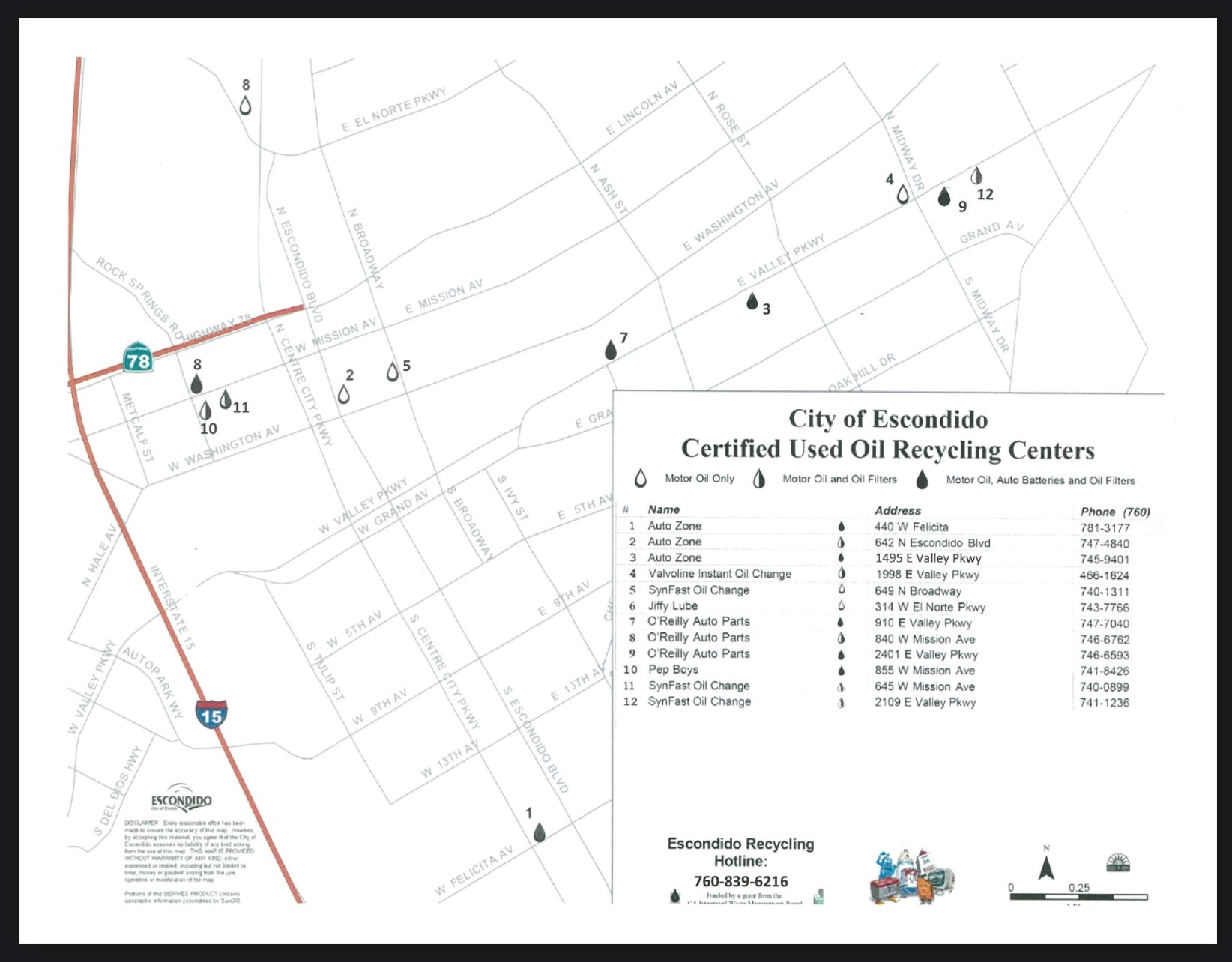 Do you change your car’s motor oil? Did you know that State-certified Used Oil Collection Centers will take your used motor oil and will render upon request the recycling incentive? View a Map of Our Certified Used Oil Collection Centers (JPG) here in Escondido.